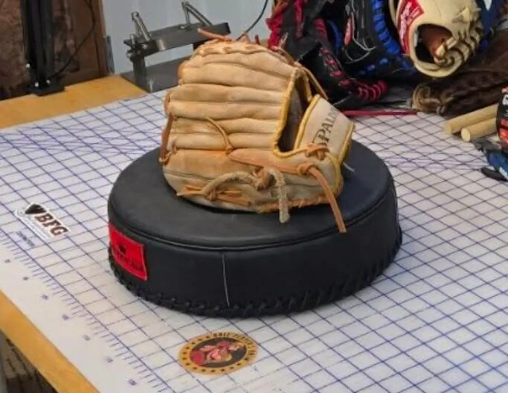 Thirteen inch circle, Black leather pounding pad with Ball Player's Balm alternate, crown logo patch and stamped main logo